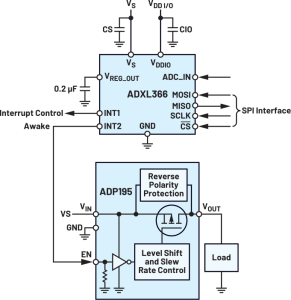 Một lĩnh vực khác mà cảm biến quán tính đang cung cấp khả năng quan trọng là trong việc sử dụng các hệ thống IoT, được dùng để liên tục giám sát vị trí và tình trạng sinh lý của động vật. Các hình thức điển hình bao gồm thẻ gắn vào tai, đuôi hoặc thân, và vòng cổ thông minh đeo quanh cổ. Những thẻ này có thể giúp quản lý vị trí đàn và quan trọng hơn là cung cấp thông tin liên tục về sức khỏe động vật, chẳng hạn như hoạt động, thời gian cho ăn và nhịp thở, và các khả năng mới hơn cho phép theo dõi nhịp tim và các dấu hiệu sinh tồn khác. Vòng cổ đeo quanh cổ đã trở thành công cụ vô giá để phát hiện chu kỳ động dục ở gia súc, sự nhai lại, chứng què chân và các tình trạng khác. Một yêu cầu cốt lõi trong các hệ thống IoT này là mức tiêu thụ điện năng vì việc duy trì pin (có thể sạc lại hoặc pin dùng một lần) trong các đàn lớn là một công việc khó khăn. ADXL366 cung cấp khả năng chưa từng có về mặt này. Gia tốc kế ba trục này có thể kết nối trực tiếp với pin vì nó được điều chỉnh bên trong, có thể hoạt động ở điện áp thấp đến 1,1 V và có thể cung cấp dữ liệu chuyển động ở tần số 100 Hz với mức tiêu thụ năng lượng khoảng 1 μW. Ở mức này, mức tiêu thụ năng lượng thấp hơn cả sự tự phóng điện của pin cúc áo. Khi được sử dụng trong vòng cổ đeo ở cổ, gia tốc kế có thể chuyển đổi giữa chế độ công suất thấp và chế độ nhiễu thấp, cung cấp tín hiệu tối thiểu trong khoảng từ 3 mg đến 8 mg rms — đủ để phân biệt giữa nhịp nhai, nhịp thở và nhịp thở (R-R). Khả năng theo dõi dấu hiệu sinh tồn được nâng cao được cung cấp bởi ADXL380, hoạt động với mức nhiễu thấp hơn gần hai bậc độ lớn trên băng thông 4 kHz. Để so sánh công bằng ở băng thông 200 Hz, mức nhiễu tương đương của gia tốc kế này sẽ là 0,4 mg rms. Tỷ lệ tín hiệu trên nhiễu (SNR) như vậy, kết hợp với băng thông rộng, có thể biến gia tốc kế ba trục này thành một ống nghe có khả năng thu thập thông tin nhịp tim thông qua phép đo điện tâm đồ hoặc các loại tiếng ồn khác nhau liên quan đến hô hấp, tiêu hóa và các chức năng sinh lý khác. Bảng 1 so sánh hai gia tốc kế. Một khả năng cốt lõi khác được cung cấp bởi các cảm biến quán tính siêu tiết kiệm năng lượng là quản lý năng lượng ở cấp hệ thống của các nút IoT. ADXL366 cung cấp chế độ đánh thức chuyên dụng có thể được sử dụng để khởi động lại các hệ thống điện tử bằng cách phát ra các ngắt dựa trên các cấu hình chuyển động được phát hiện. Một cấu hình điển hình có thể được tìm thấy trong Hình 4. Các gia tốc kế cung cấp một tập hợp phong phú các tham số có thể lập trình để cấu hình cấu hình chuyển động mong muốn và, quan trọng nhất, đánh thức và lấy mẫu ở băng thông đầy đủ. Khả năng này rất quan trọng để tránh hiện tượng răng cưa và phát hiện sai. Ở chế độ đánh thức, ADXL366 chỉ tiêu thụ một lượng điện năng đáng kinh ngạc là 180 nA. Bằng cách tận dụng khả năng này, các cảm biến, bộ thu phát vô tuyến và các thành phần khác tiêu thụ nhiều năng lượng có thể được tắt nguồn khi không cần thiết để tăng tuổi thọ hữu ích của nút cảm biến.