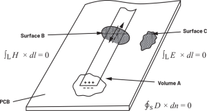 Bài viết cũng mô tả các thuộc tính của đường truyền. Hầu hết các kỹ sư đều biết về đường truyền và sử dụng chúng hàng ngày cho các mạch tốc độ cao. Để tránh nhiễu cũng như EMI, các kỹ thuật đường truyền này phải được sử dụng cho tất cả các ứng dụng PCB. Có lẽ cấu trúc được sử dụng nhiều nhất trong thiết kế PCB là đường truyền vi dải, về cơ bản chỉ là một đường dẫn trên mặt đất. Về lý thuyết, đường dẫn này sẽ giới hạn điện trường và từ trường trong không gian giữa đường dẫn và mặt đất. Hình 1 cho thấy trong thể tích A, các phương trình Maxwell phát biểu rằng tổng điện tích được bao bọc bằng tích phân của thông lượng điện đi qua bề mặt thể tích. Vì điện tích bằng 0 được bao bọc, nên điện trường tổng hợp bên ngoài bề mặt sẽ tiến tới 0 khi khoảng cách giữa các điện tích bằng nhau và trái dấu nằm cùng vị trí. Đường truyền, bề mặt B, sẽ bao bọc điện tích gia tốc bằng 0. Các phương trình Maxwell phát biểu rằng tích phân đường của từ trường xung quanh bề mặt B này cũng sẽ tiến tới 0 nếu dòng điện tổng hợp qua bề mặt bằng 0. Theo định luật Faraday, tích phân đường xung quanh bề mặt C cũng sẽ tiến tới 0.