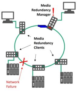 Giờ đây, bạn có thể thấy dự phòng hệ thống hỗ trợ tính khả dụng cao cũng như tăng tính khả dụng của hệ thống bằng cách sử dụng NAP và AR. Chúng ta cũng có thể hỗ trợ tính khả dụng cao bằng cách sử dụng dự phòng phương tiện. Khi nói về dự phòng phương tiện, chúng ta thực sự muốn nói đến dự phòng mạng. Và cách PROFINET hỗ trợ dự phòng phương tiện (mạng) là thông qua việc sử dụng các cấu trúc vòng. Lý do chúng ta sử dụng vòng là vì nếu cáp hoặc kết nối vật lý bị đứt, hoặc một thiết bị bị lỗi, mạng có thể trở lại cấu trúc đường dây – duy trì hoạt động của hệ thống. Tuy nhiên, việc hỗ trợ dự phòng mạng bằng vòng đồng nghĩa với việc chúng ta không thể sử dụng các giao thức thường được sử dụng trong mạng CNTT như Giao thức Cây Mở rộng (STP) và Giao thức Cây Mở rộng Nhanh (RSTP). Điều này là do STP và RTSP thực sự ngăn chặn dự phòng mạng bằng cách chặn các đường dẫn dự phòng để ngăn các khung dữ liệu lưu thông mãi mãi trong mạng.